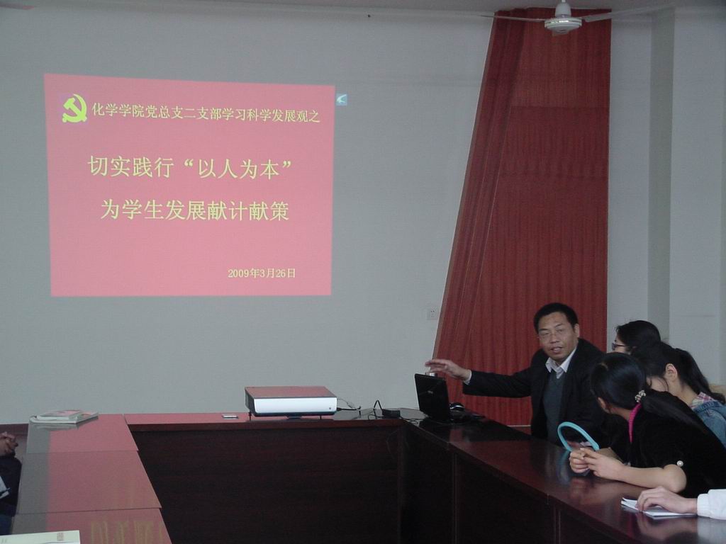 党总支学生第二支部在实验大楼学术报告厅开展了以“切实践行‘以人为本’,为学生发展献计献策”为主题的深入学习实践科学发展观的活动。活动由院党总支副书记李荣教授主持,支部全体党员及各年级有考研意向的同学参加了此次活动。