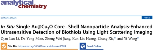 生物硫醇在人体生理过程中起着关键作用,其浓度异常会引发多种病理现象。然而,传统检测方法存在仪器昂贵、操作复杂、易受环境干扰、重复性差等问题。针对上述挑战,该工作基于暗场显微镜的高信噪比、高灵敏度和高时空分辨率,结合单颗粒分析的浓度极化效应,构建了原位单颗粒光散射分析方法,实现了对生物硫醇的超灵敏检测。该工作首先合成了一种Au@Cu2O核壳结构的纳米颗粒,利用Cu(I)与生物硫醇中巯基的特异性结合,触发Cu2O外壳瓦解崩塌,基于Au@Cu2O NPs探针散射光颜色和强度的变化,在较宽浓度范围内是实现了两种生物硫醇半胱氨酸(0.05-3 nM)和谷胱甘肽(0.1-10 nM)的高灵敏检测,展现出该方法对复杂生物样本检测的应用前景。相关成果以“In situ Single Au@Cu2O Core-Shell Nanoparticle Analysis-Enhanced Ultra-Sensitive Detection of Biothiols Using Light Scattering Imaging” 为题发表于《Analytical Chemistry》。a动漫