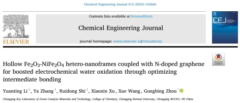 近日,我院表界面能源转化创新团队周功兵教授课题组以《Hollow Fe2O3-NiFe2O4 hetero-nanoframes coupled with N-doped graphene for boosted electrochemical water oxidation through optimizing intermediate bonding》为题在《Chemical Engineering Journal》(中国科学院大类一区TOP期刊,影响因子13.4)上发表最新研究成果,化学学院研究生黎元婷为第一作者,周功兵教授为唯一通讯作者a动漫 为唯一署名单位