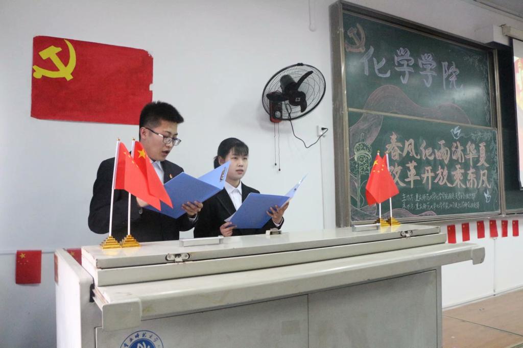 李昭瑩等十位同学带来的诗朗诵《不忘初心》,用一句句铿锵的话语,表达出了新一代大学生跟党走的坚定信念和昂扬向上的拼搏斗志。聆听完气势如虹的朗诵,全班同学在闻洪林的带领下共同唱起了《我爱你中国》。现场歌声嘹亮,国旗挥舞,大家的爱国之情好似被瞬间激发,这是一个拥有强大凝聚力的班集体对祖国最深沉的告白,是17级化师四支部全体同学对坚定信念的极佳诠释。这歌声,使每一位同学心潮澎湃,也把整个活动引入了高潮!