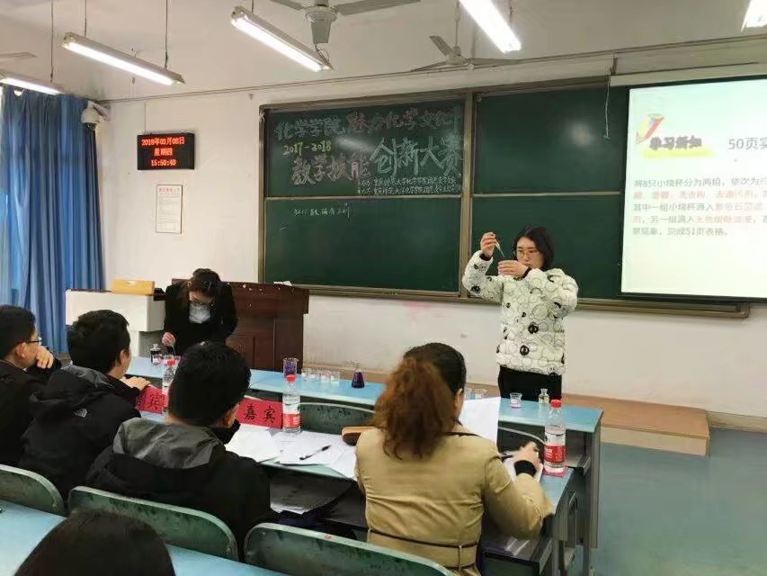 为了进一步增强a动漫 师范生实践应用能力和创新能力,提升师范生的综合素养,彰显师范特色,强化学生教学技能,同时响应化院第三届"魅力化学文化节",在3月8日下午弘德楼15102,化院针对2015级的同学开展了“教师技能创新大赛”。参赛者有郝静、尹巧、王春华等人,到来的嘉宾有杜小旺老师、许应华老师、曹书梅老师、胡晋川老师以及周琦老师。