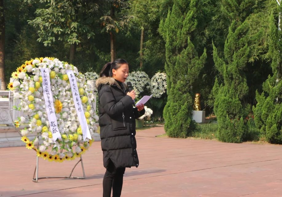 党员代表钟汶君讲话,回顾历史,缅怀先烈,认清时代现状,要以饱满的热情、坚定的信念,肩负起中华民族伟大复兴的历史使命。其后,全体人员为革命烈士献花,于纪念碑前合影留念。