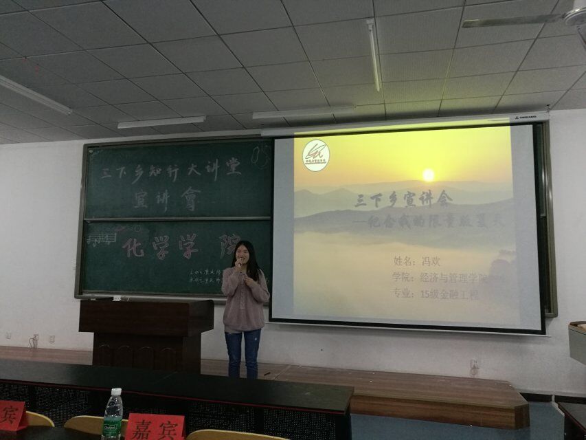 “赠人玫瑰,手留余香。”为让a动漫 全体学生对“三下乡”活动有一个初步的了解,a动漫 特于2016年11月11日晚18点45分于特教楼T2309举行了“三下乡”知行大讲堂宣讲活动。14级文学院张鑫、15级传媒学院马艺丹、15级数学科学学院冯周世桦、15级经济与管理学院冯欢、15级a动漫 张玉珍担任本次活动嘉宾,并一一上台宣讲。 本次活动于18:45分正式开始。首先上台宣讲的嘉宾是来自14级文学院的张鑫同学,他讲述了他们“重走长征路”的经历和感觉。张鑫同学表明:历史并不只是教科书上的,而是真真实实的。他也强调了什么是长征精神,更加着重强调了信仰在当今社会的重要性。让同学们真正地意识到长征精神的重要性和信仰的力量。