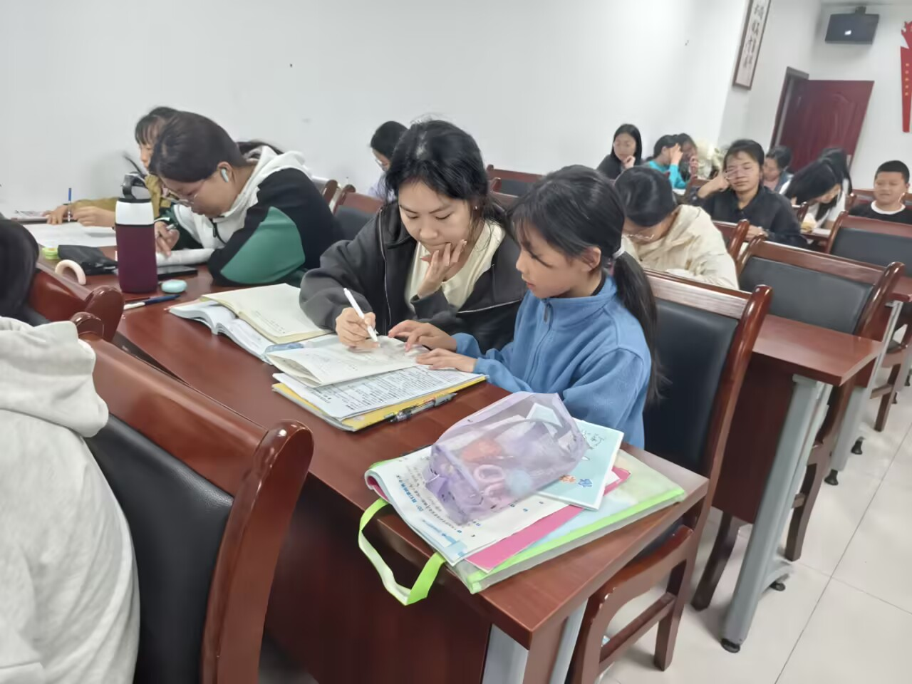 针对不同年龄段孩子的学习需求,志愿者们实行“分层辅导策略”。低年级教室传来阵阵欢笑声,志愿者们正用彩色卡片教孩子们记忆英语单词,“apple是红色的,banana是黄色的……”通过视觉联想和肢体动作,让枯燥的单词记忆变得趣味盎然;高年级区域则呈现出另一番景象,志愿者们围绕中考数学重难点,为初三学生小宇量身定制几何模型解题方案,从辅助线添加技巧到定理应用逻辑,一步步拆解难点,小宇紧锁的眉头逐渐舒展,在草稿纸上写下完整的解题过程后,兴奋地与志愿者击掌庆祝。