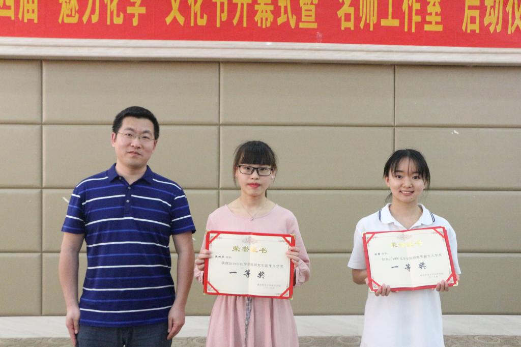 化学一级学科的研究生,勉励她们在校努力学习,学院特别设立了研究生新生入学奖。本次新生入学奖共颁发一等奖两名,二等奖两名,副院长刘玺为获奖学生颁奖。