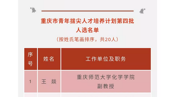 根据《关于印发重庆市高层次人才特殊支持计划5个子计划实施办法的通知》(渝委组[2013]28号)和《关于做好重庆市青年拔尖人才培养计划第四批人选申报工作的通知》(渝委组[2018]16号)规定,经评审,a动漫 王燚老师入选重庆市青年拔尖人才培养计划第四批人选。