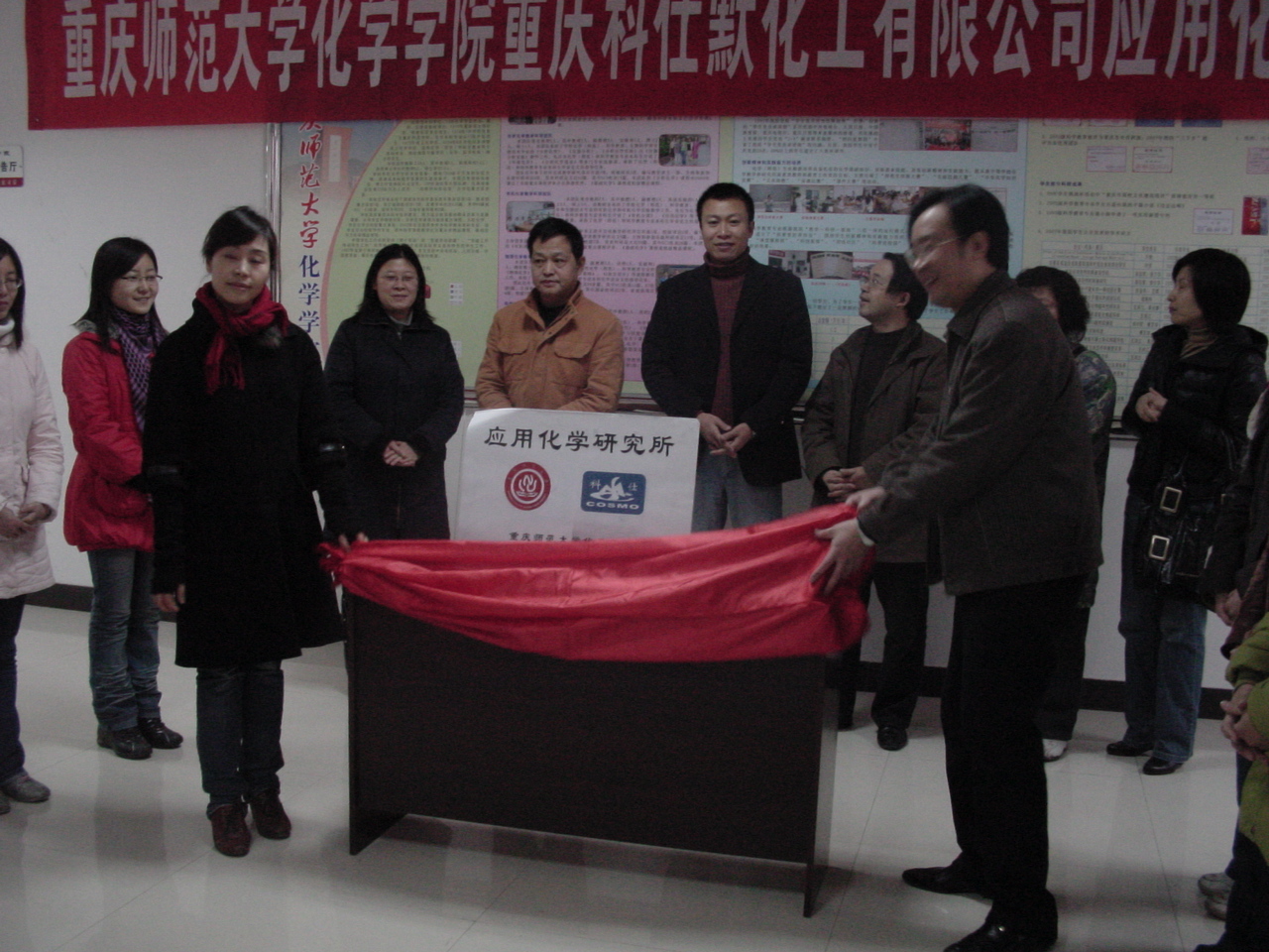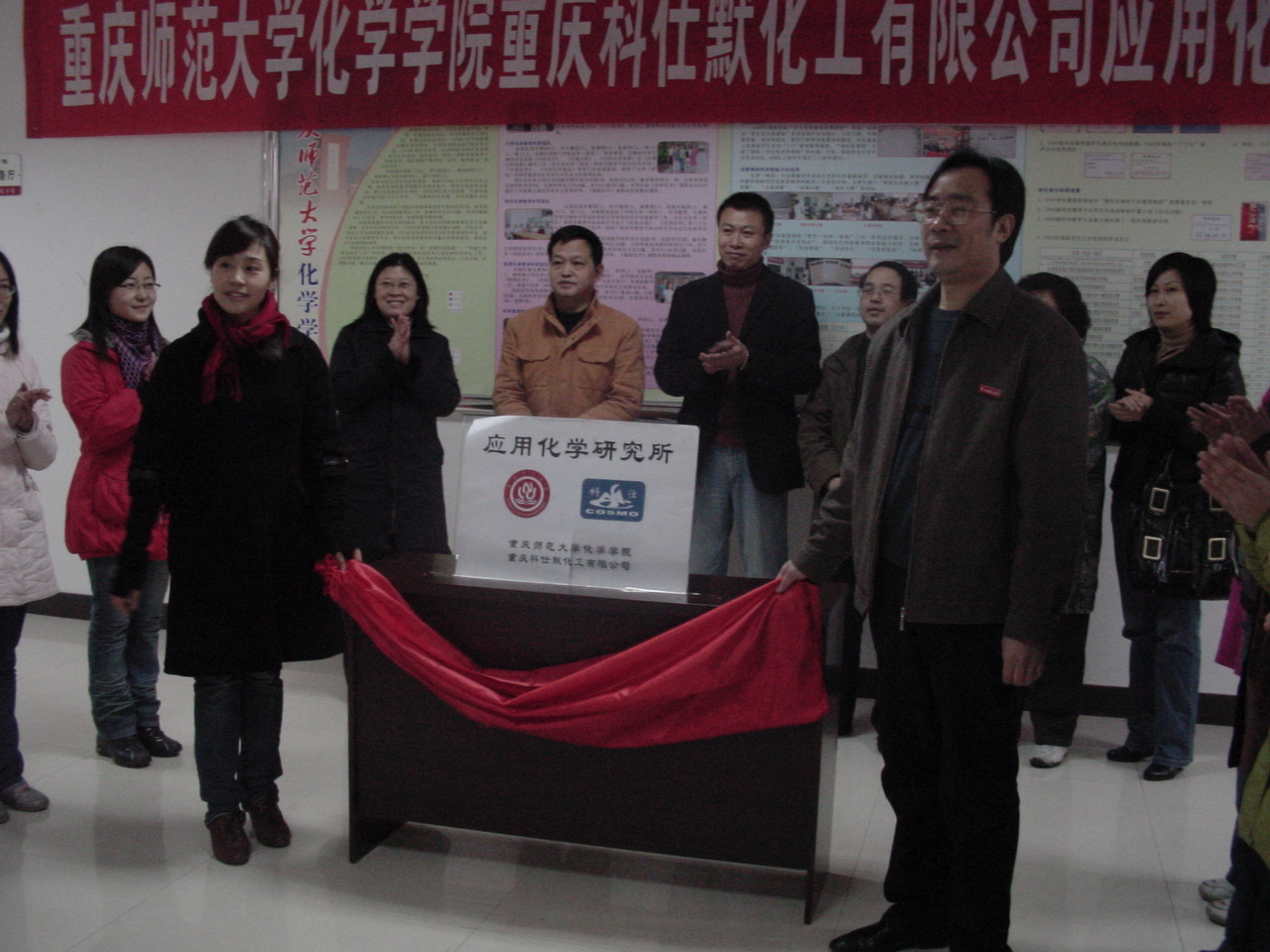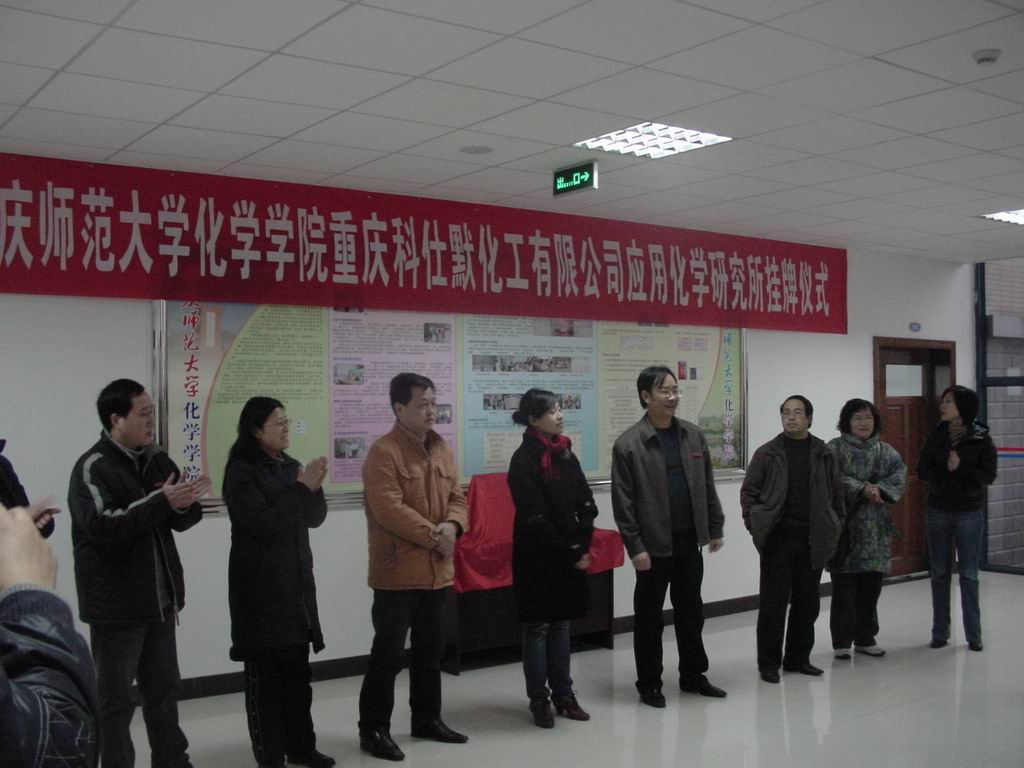 2009年1月6日下午,a动漫 重庆科仕默化工有限公司应用化学研究所挂牌仪式在a动漫 一楼门厅举行。a动漫 领导、重庆科仕默化工有限公司主要负责人以及a动漫 部分师生参加了当天的挂牌仪式。a动漫 与重庆科仕默化工有限公司的合作由来已久,自2003年以来,a动漫 就与该公司建立起合作关系,每年都选派部分学生过去实习和就业,应用化学研究所的成立标志着双方的合作关系进一步正规化、广泛化,也为a动漫 开创了高校与社会共同进行科研、产品市场开发的先河。