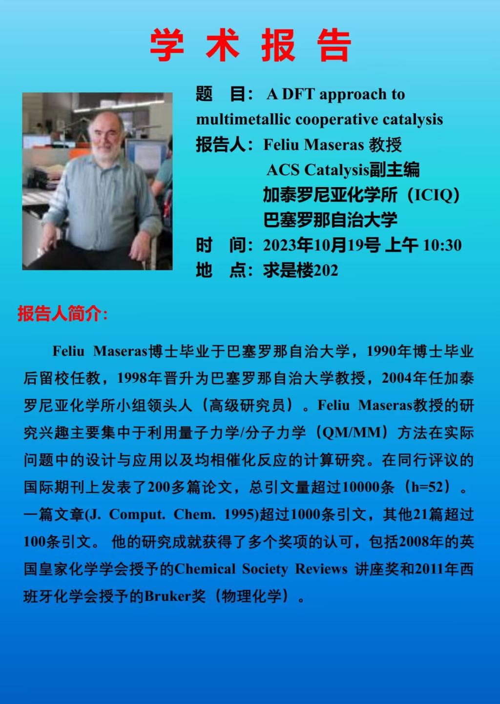 学术报告预告:Feliu Maseras教授——A DFT approach to multimetallic cooperative catalysis